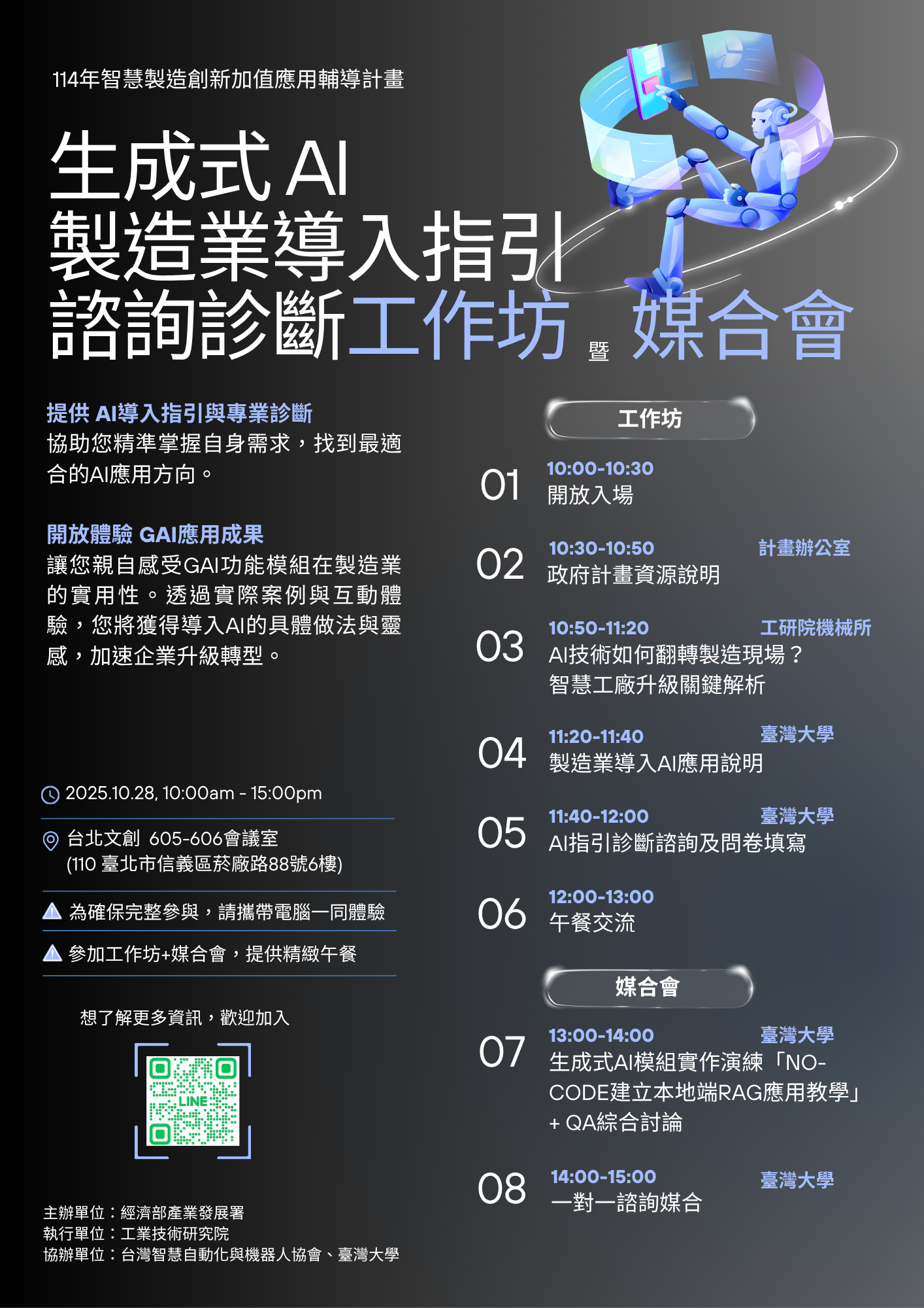 三、活動重於生成式AI的實務操作與技術媒合,透過實際演練,協助企業快速 掌握如何建立在地端GAI應用, 將分散的技術文件、產品資料轉化為可即睹查詢與應用的智慧知識庫。這不僅能提升企業內部的知識傳承與決策效率,更能在研發、採購及客戶服務等環節創造實質效益。最後的一對-媒合與諮詢,則讓廠商能夠直接與專家、技術服務商交流,找到最符合需求的合作解方,加速落實轉型成果。