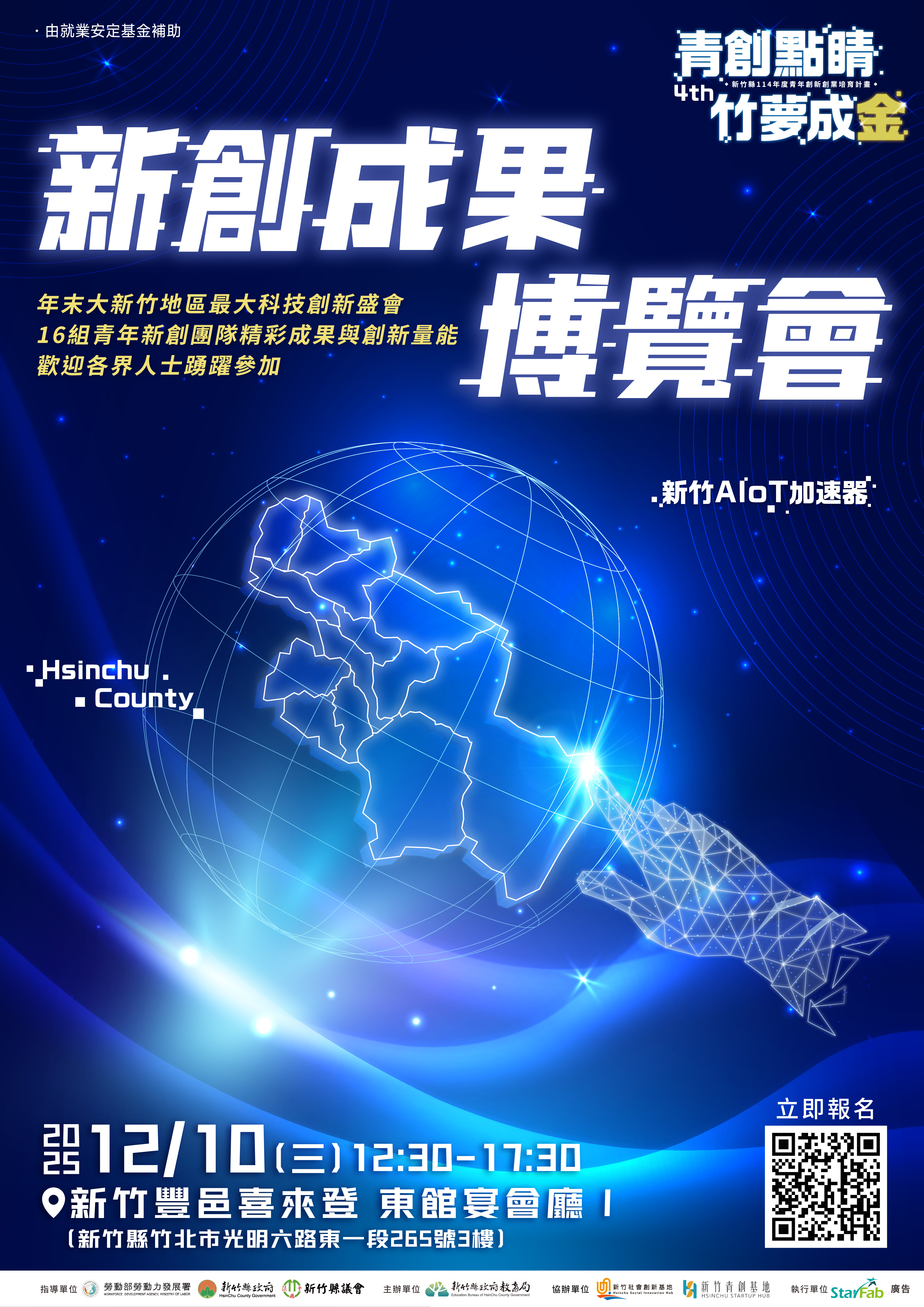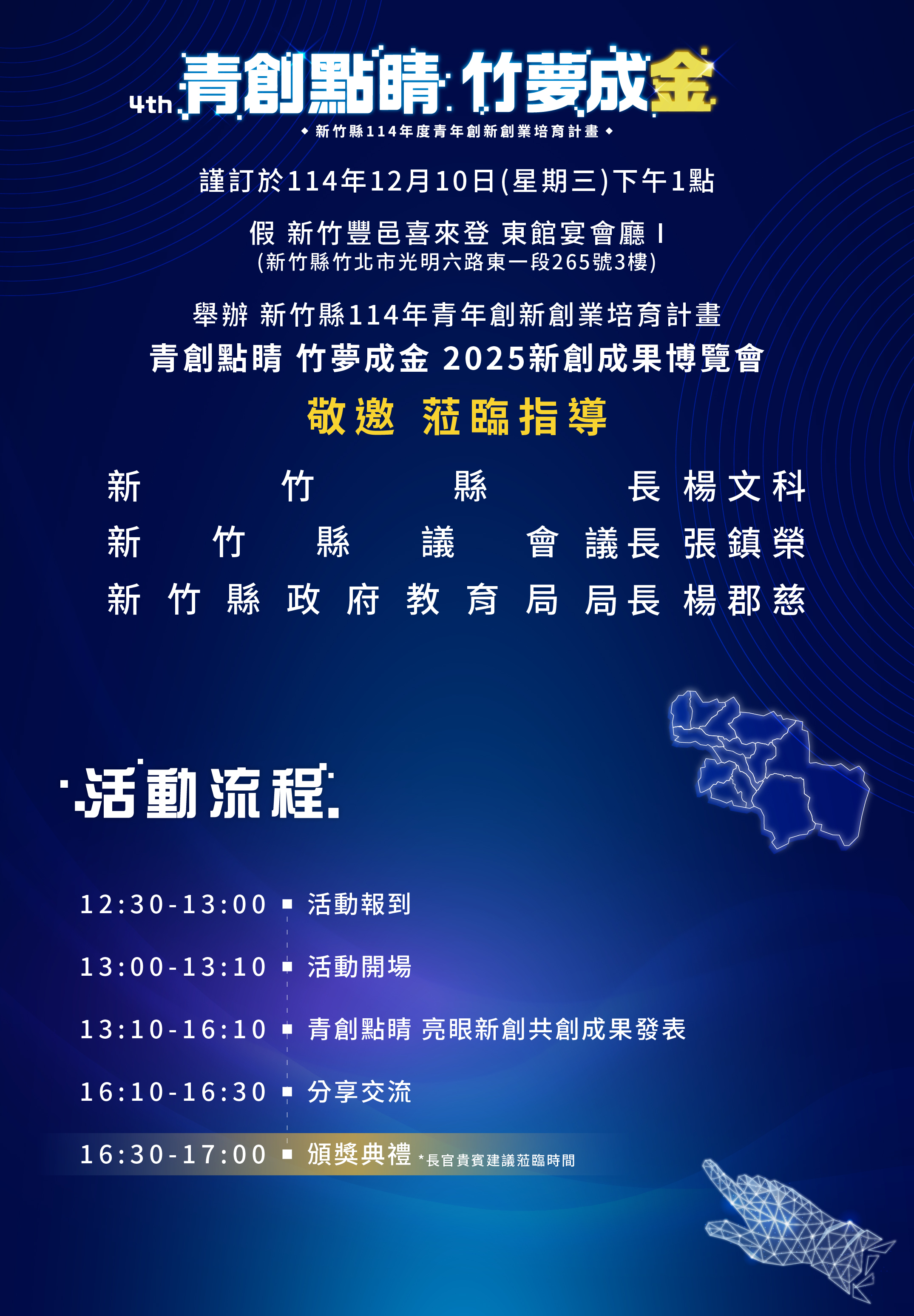 轉知新竹縣政府辦理「青創點睛 竹夢成金 2025新創成果博覽 會」,即日起開放報名相關事宜。 |